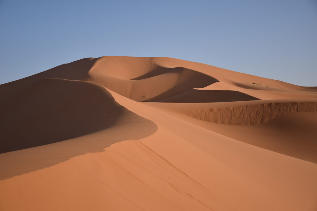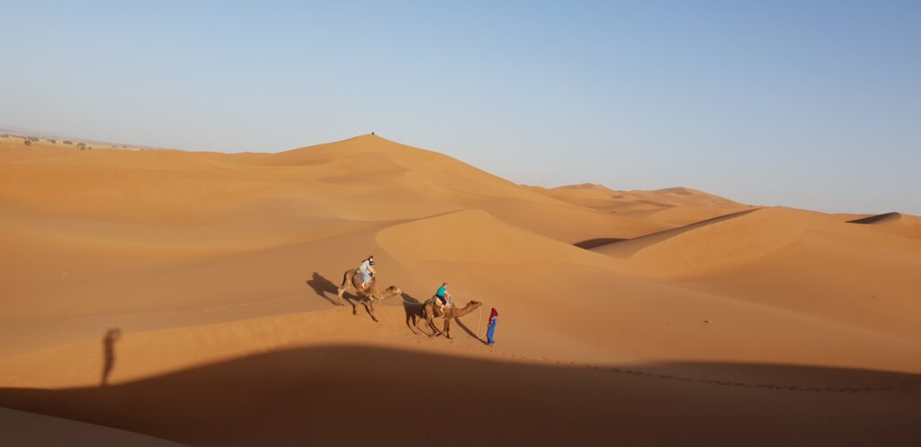 Daher konzentriert sich unser Reiseangebot auf Touren mit dem Schwerpunkt Wüstentouren in der Region M´Hamid Zagora. Hier findet sich die größte und höchste Dünenlandschaft Marokkos, die nach einer längeren Fahrt durch verschiedenste Wüstenformationen ab M´Hamid mit dem Jeep gut erreichbar ist. Zu Fuß oder mit dem Kamel kann man natürlich ebenfalls dorthin gelangen. Und danach bietet sich auch von dort aus weiter ein Kameltrekking oder eine Wanderung durch die atemberaubend schöne Dünenlandschaft der Sahara an.